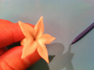 To finish the petals, draw the tip of the stick from the hole to the tip of each petal, using your finger as a curved mold for the petal as you go. You can see the petal is curved over my index finger: