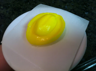 Tonight's tribute to Wyoming, "The Cowboy State," isn't a 10-gallon hat; it's more of a 2-milliliter hat. You can pipe them in any color; yellow is all I had on hand, which is perhaps more Curious George than cowboy. Anyway, all you'll need to pipe teeny-tiny hats is stiff consistency royal icing, petal tip #104, round tip #12, a glue stick, parchment paper squares, a flower nail, a Styrofoam block to rest the nail in, and a dusting pouch filled with a 50/50 mix of cornstarch and powdered sugar. Start by sticking a parchment square to the nail with a dab from the glue stick.